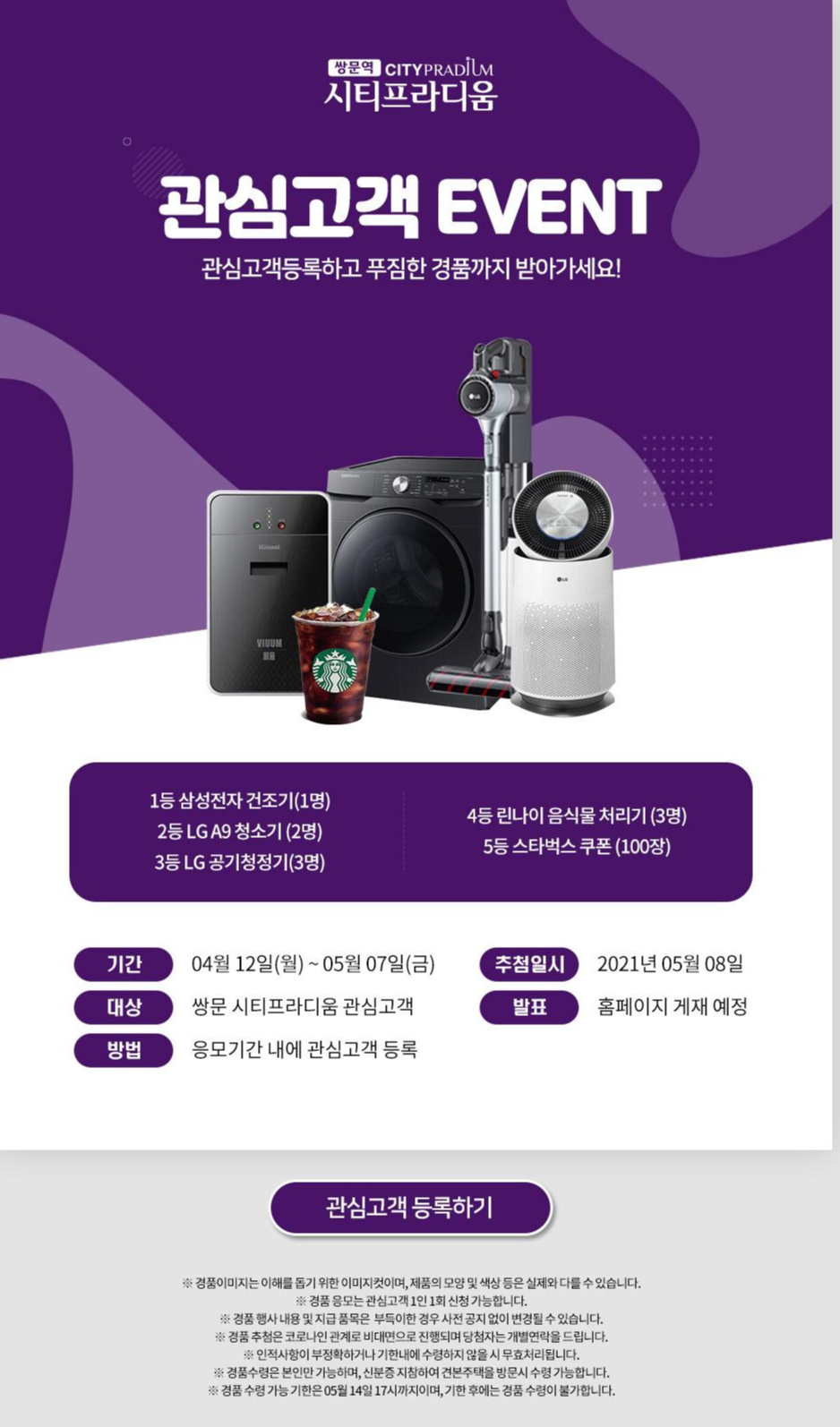 현재 쌍문역 시티프라디움 홈페이지에서 관심고객 이벤트도 진행하고 있는데요. 건조기, 청소기, 공기청정기, 음식물 처리기 등 아주 경품이 빵빵하니 이벤트 등록도 해보세요~